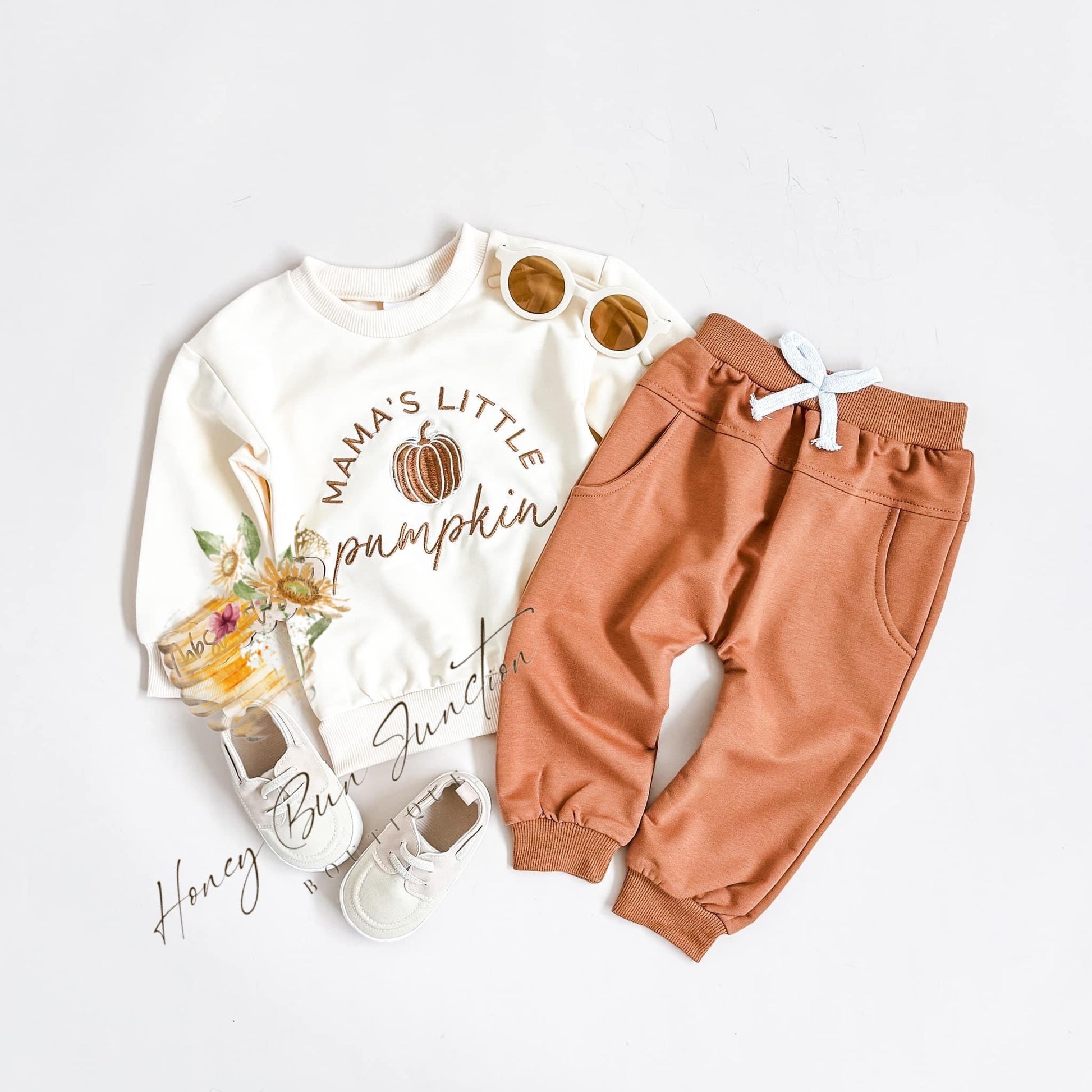 Dress up your little guy this fall with our Boys Mama's Little Pumpkin Set! This 2 piece set includes a cream colored top featuring a cute "Mama's Little Pumpkin" design, paired with matching brown joggers. Perfect for any fall occasion, your little one will look adorable and feel comfortable.