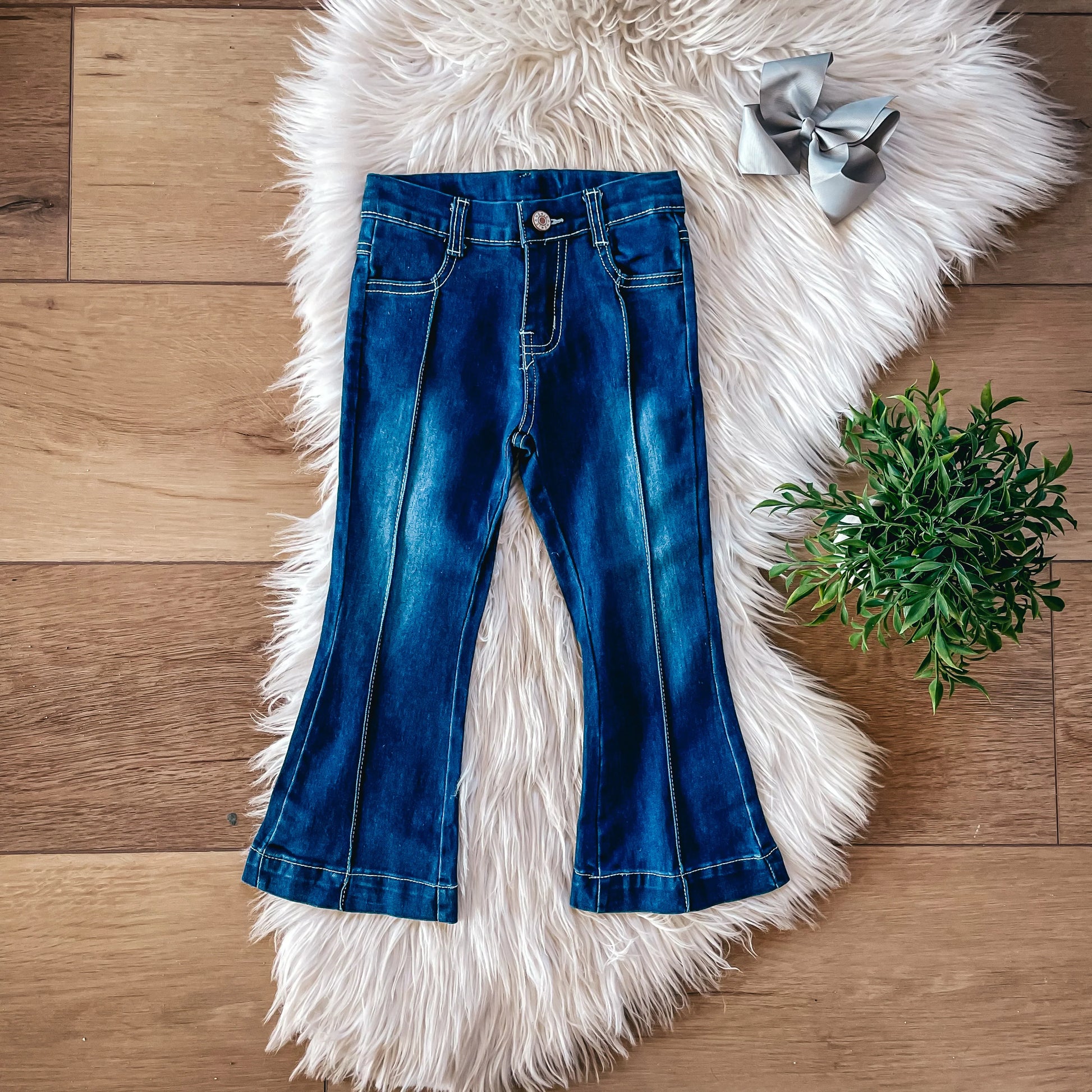 These girls' flare jeans in a rich dark wash bring fun and flair to any outfit. Featuring a stylish seam down the center and handy pocket details, they combine cool design with practical comfort. Crafted with amazing quality, they’re perfect for twirling, playing, and making every day a little more playful.