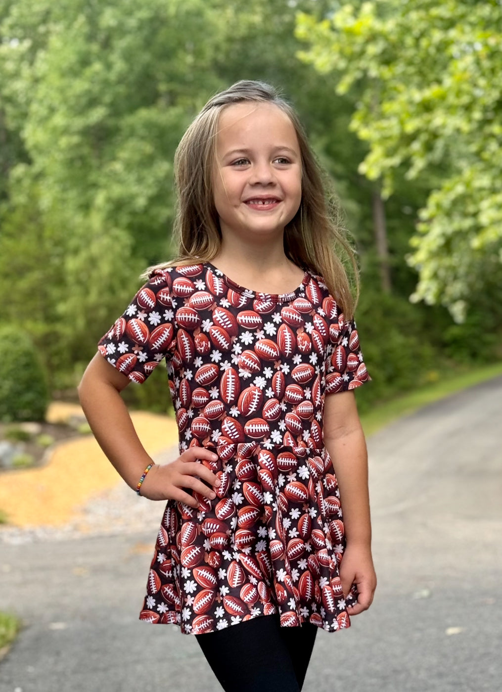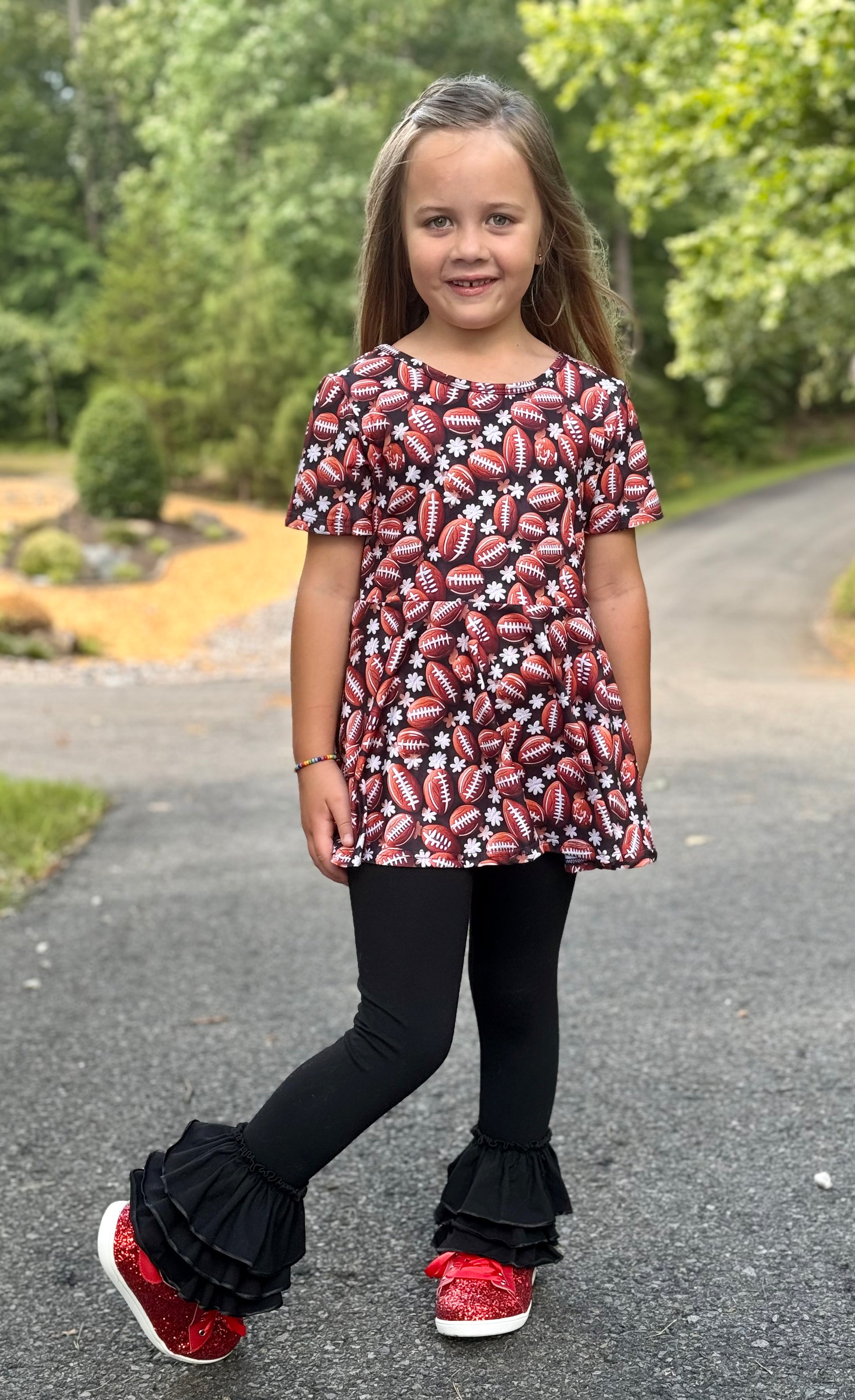 Go for a touchdown with our playful Girls Football Peplum! Featuring a fun football print and a stylish peplum style, your little one will score major style points. Perfect for any game day, this top will be a winning addition to her wardrobe. (Sports puns not included.)