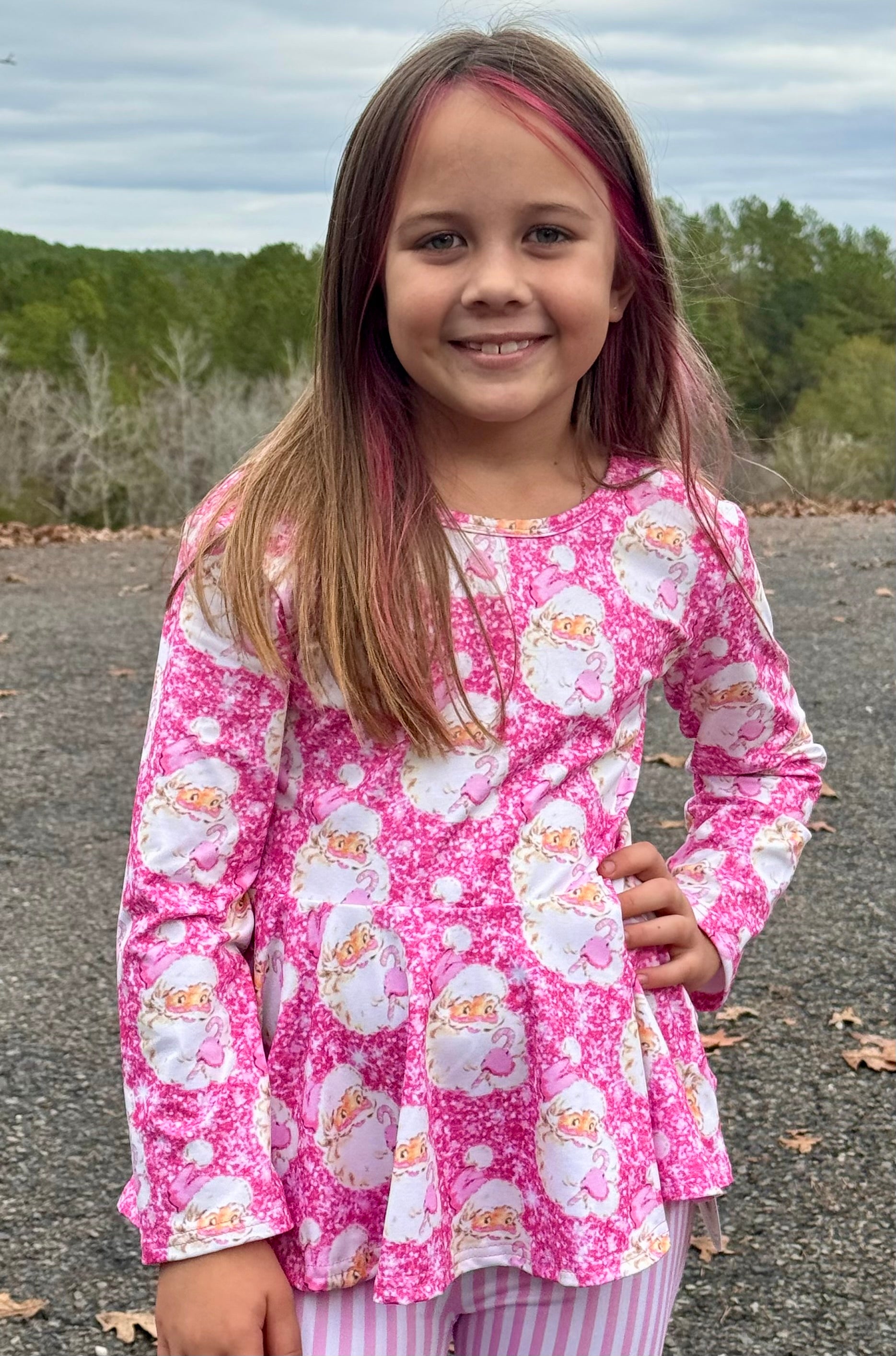 Ho-ho-ho, this adorable peplum top brings festive cheer with a playful pink Santa design that'll have her ready for holiday celebrations. The fun criss-cross detail on the back adds a fun twist, while the peplum silhouette creates a twirly, twirly vibe she'll love. Perfect for family photos, Christmas parties, or spreading seasonal joy wherever she goes. A must-have for little ones who want to celebrate in style!
