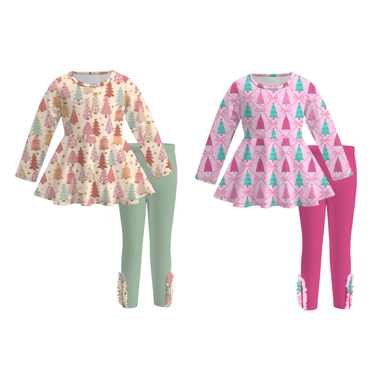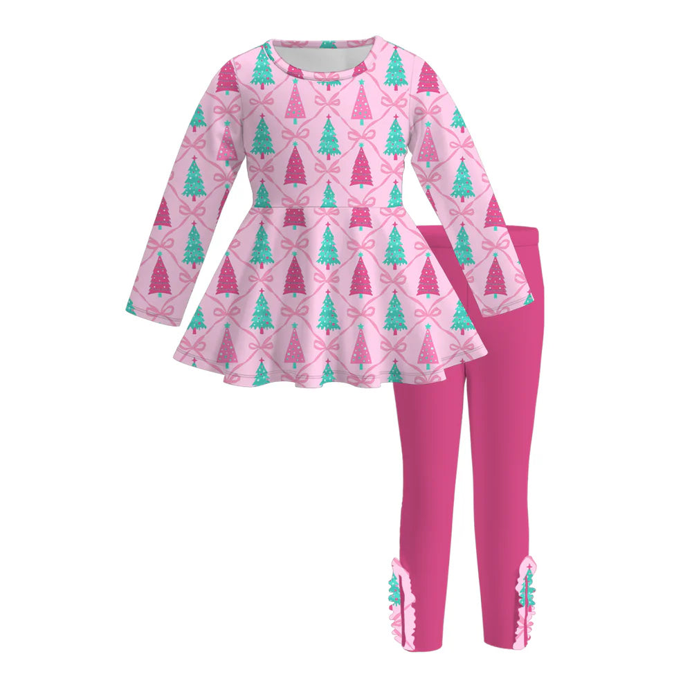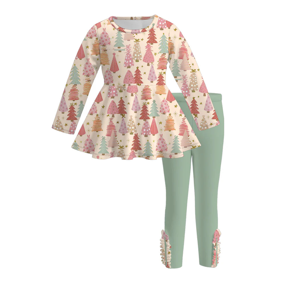 Get festive with our Girls Christmas Tree Print Leggings Sets! Featuring adorable holiday tree prints, this comfy set is perfect for playful days and cozy winter nights. Soft and stretchy fabric moves with your child, making it ideal for holiday fun and family gatherings. Add a dash of merry style to her wardrobe this season!
